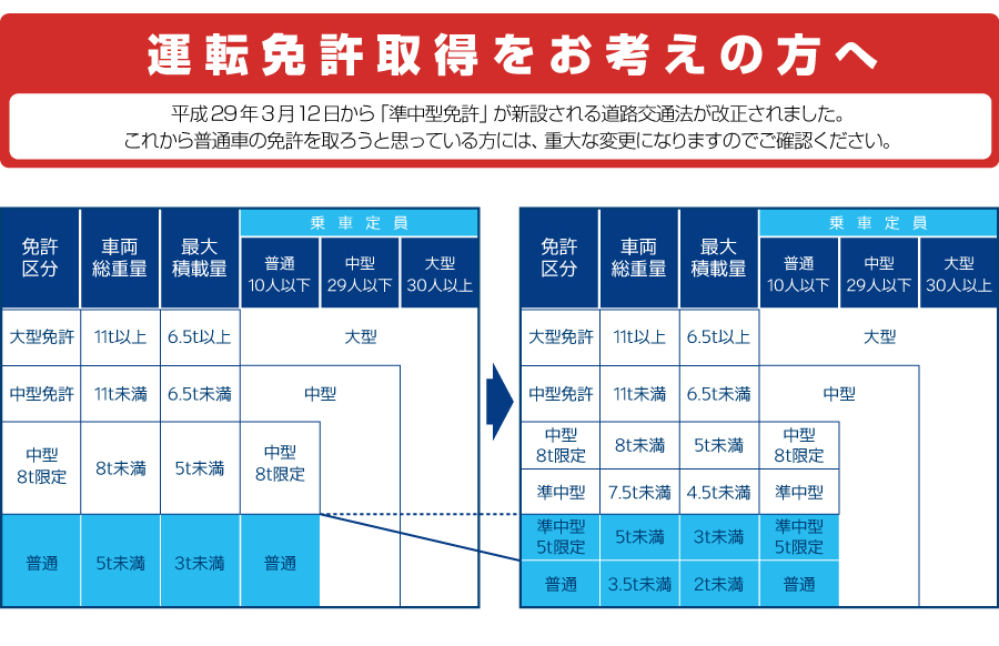 平成19年6月2日〜平成29年3月11日までに普通免許を取得した方は『準中型5t限定免許』